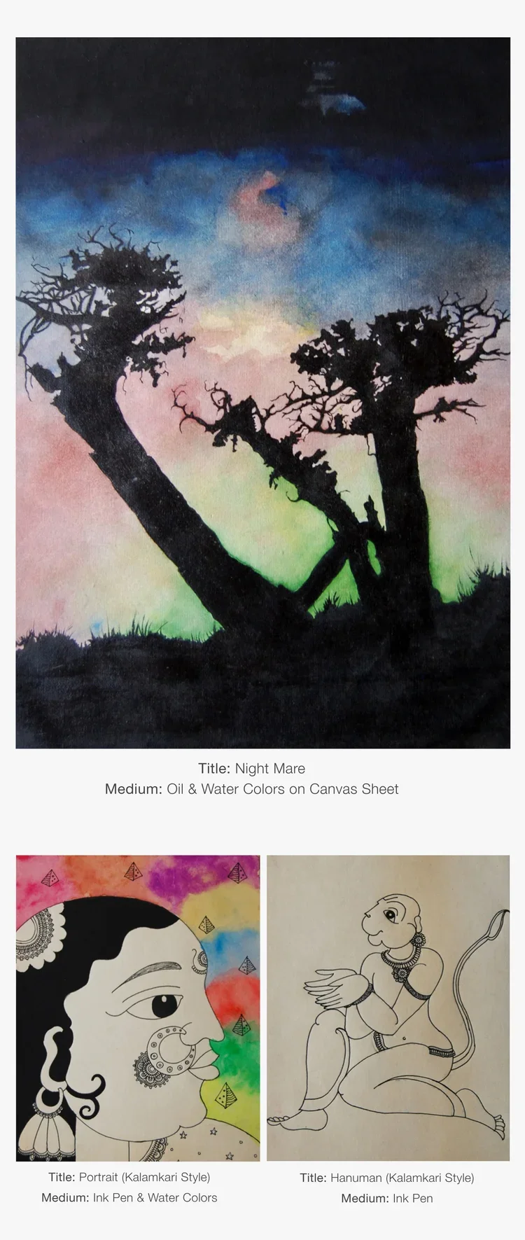 This collection includes charcoal sketches, Kalamkari-inspired pieces, nature studies, portrait explorations, and digital illustrations.